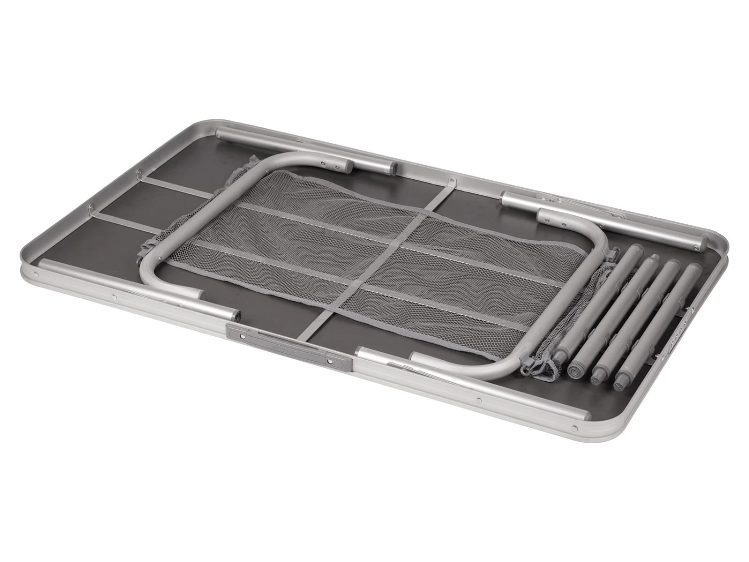 De tafel is voorzien van een lichtgewicht aluminium onderstel, een MDF gecoat tafelblad met een aluminium rand. De tafel is niet water- en hitte bestendig. De tafel is plat in te klappen en voorzien van een handig handvat zodat je hem eenvoudig mee kunt nemen.