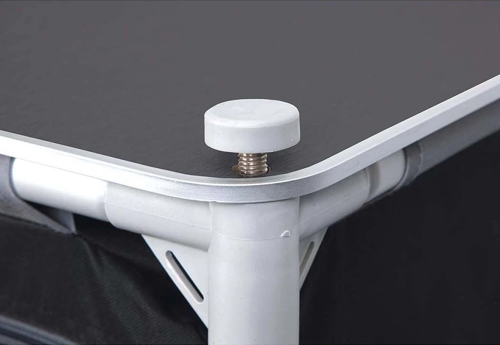 De Bo-Camp kast heeft een lichtgewicht aluminium frame met een polyester bekleding. Zowel het bovenblad als de legplanken zijn gemaakt van MDF en afgewerkt met een aluminium rand. De kast is voorzien van vier verstelbare poten zodat je de kast altijd waterpas kunt zetten op een ongelijke ondergrond. Zodra de vakantie afgelopen is kun je de kast eenvoudig uit elkaar halen en opbergen in de meegeleverde draagtas.