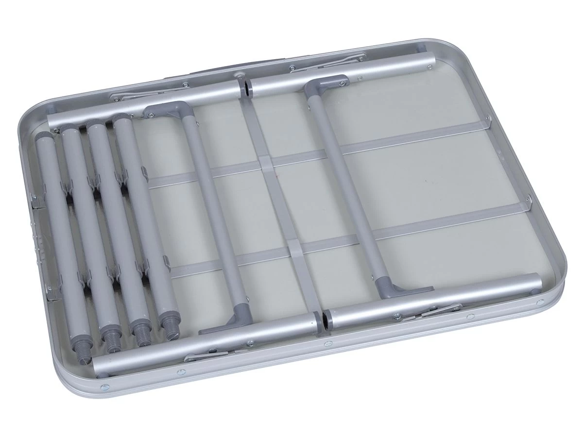 De campingtafel is voorzien van een lichtgewicht aluminium onderstel en een aluminium blad. De tafel is water- en hitte bestendig! De tafel is plat in te klappen zodat je hem eenvoudig mee kunt nemen.