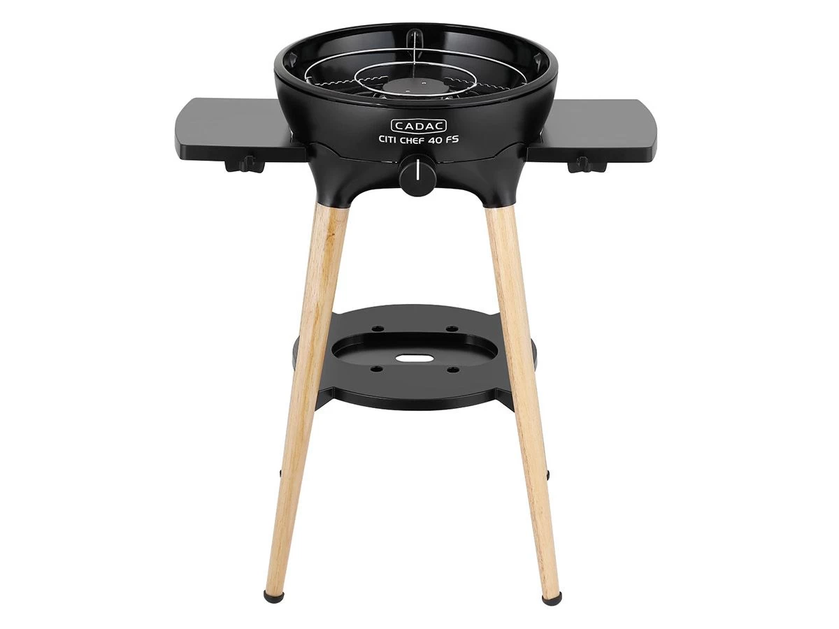 De poten zijn gemaakt van duurzaam hout en het grilloppervlak heeft een diameter van 40 centimeter. Dankzij de uitneembare, geëmailleerde vetpan is de Cadac Citi Chef 40 FS makkelijk schoon te maken. De vetpan is tevens vaatwasserbestendig. De zwarte zijtafels zijn ook makkelijk afneembaar en voorzien van ophanghaakjes.