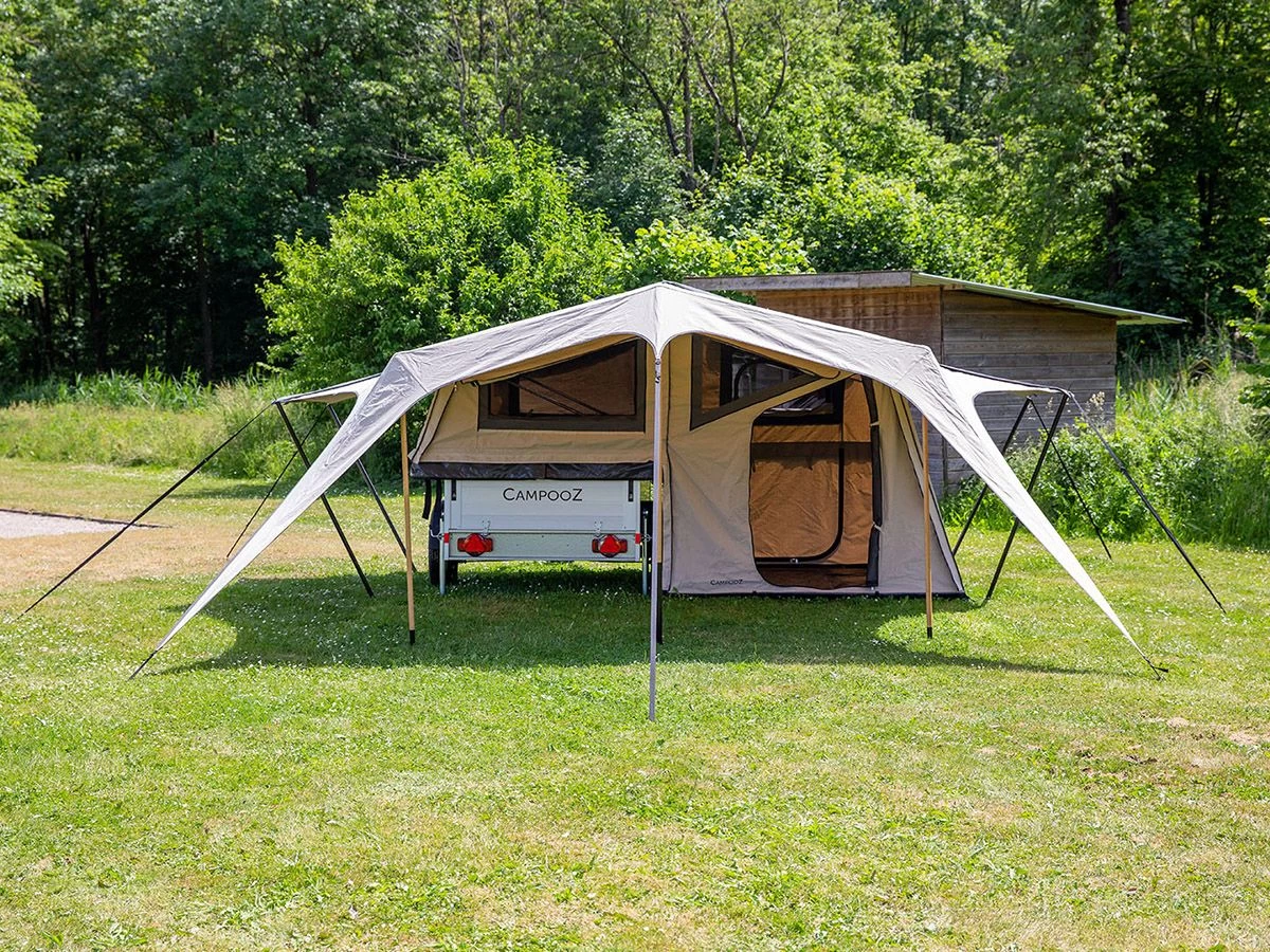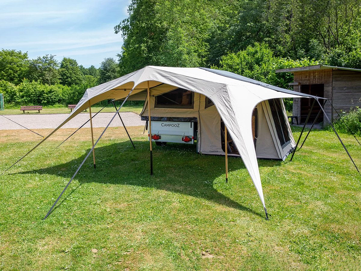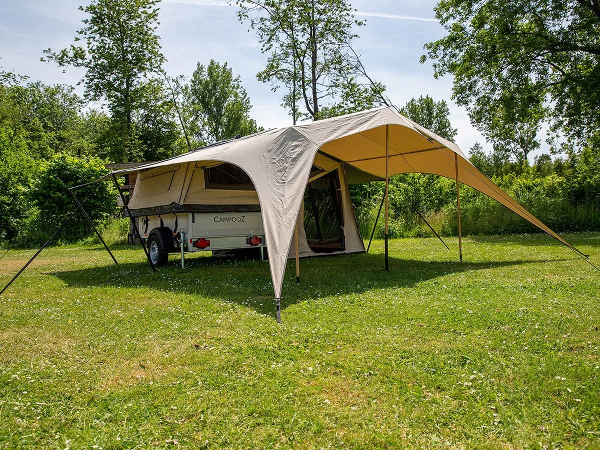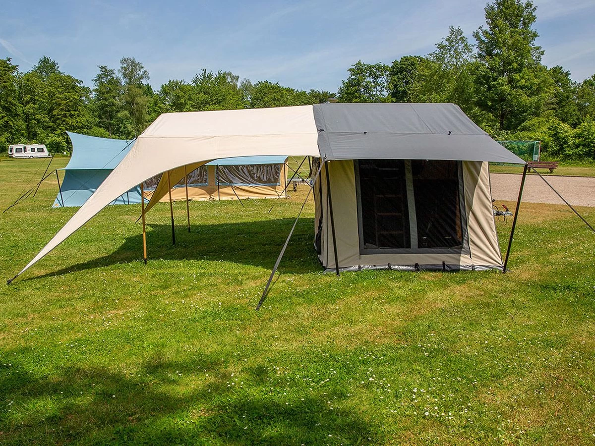 Een prachtige en karakteristieke zonneluifel van licht ripstop katoen met duurzame bamboestokken en dakliggers. De luifel kan uitgebreid worden met verschillende zijwanden.