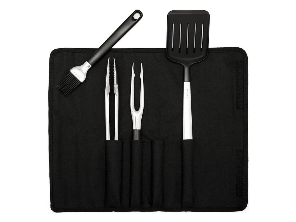 De set bestaat uit een spatel, vork, tang en een kwast. De set wordt geleverd in een handige, afsluitbare opbergtas. Alle gereedschappen zijn voorzien van een voetje, zodat ze net iets van de ondergrond liggen.