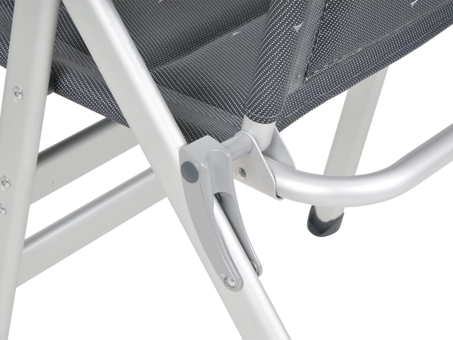 De stoel is verstelbaar in 7 standen, zodat je rechtop kunt zitten maar ook heerlijk achterover kunt liggen. Zowel de zitting als de rugleuning is voorzien van gepolsterd textileen, dit is weerbestendig en kan je eenvoudig schoonmaken.