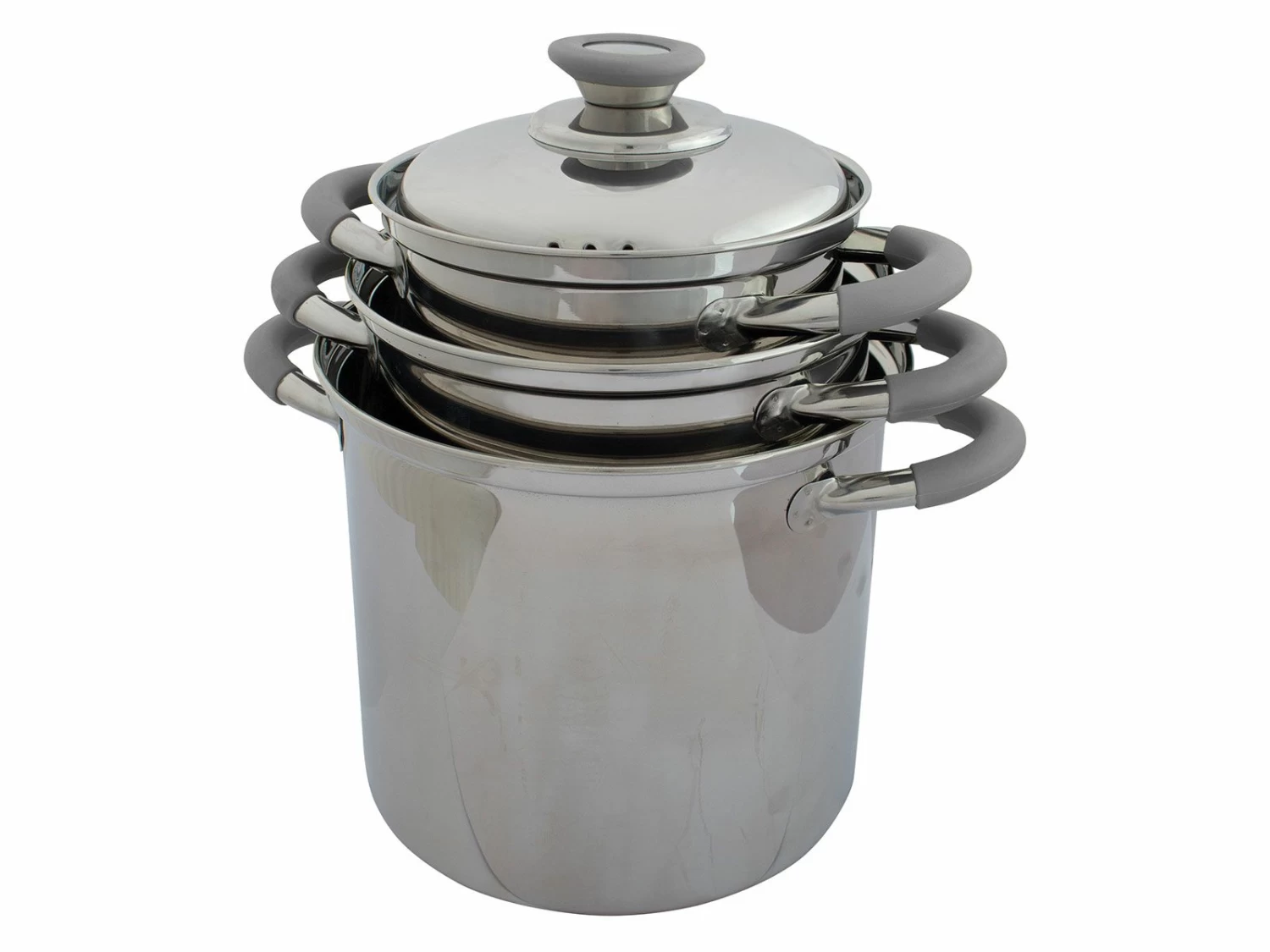 De Eurotrail Glascow is een RVS pannenset bestaande uit 3 pannen en 3 deksels. De pannen zijn voorzien van hittebestendige en beschermende siliconen handgrepen.