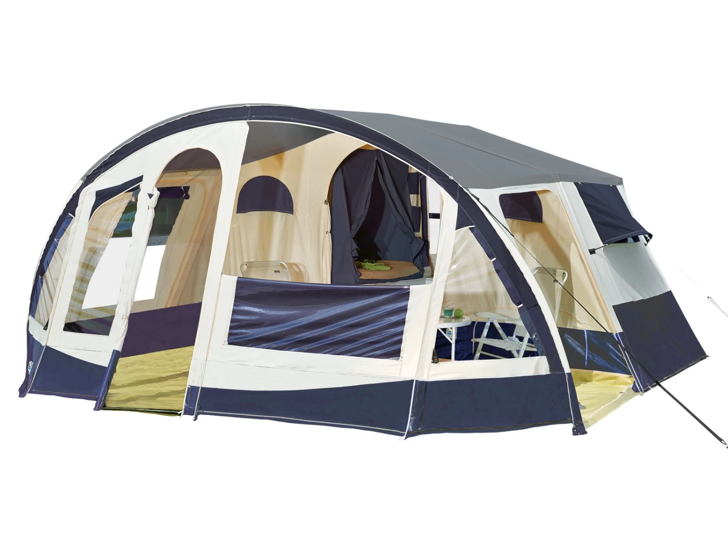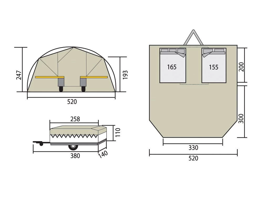 Wordt standaard geleverd inclusief: stormbandset, neuswiel + beugel, reservewiel + beugel, schokbrekers, 3-pits gaskomfoor en campingkeuken.