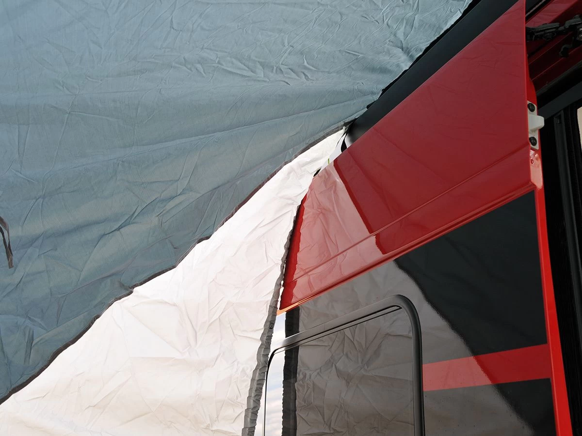 Heeft je bus een tentrail dan kun je de pees van de aansluitflap ook direct in de tentrail schuiven. Tevens is de Mallorca Easy Air uitgevoerd met een dunnere pees die direct in een Fiamma of Thule | Omnistor luifel past. Wil je de bustent nog sneller en makkelijker aan en af koppelen? Kies dan voor de optionele magneetadapter of peesadapter.