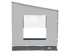 Aan de achterkant zit een schuimkussen genaaid, met een optionele aandrukstang kan je het schuimkussen tegen de wand van je camper of caravan drukken. Zo sluit de zijwand mooi tegen je voertuig aan.