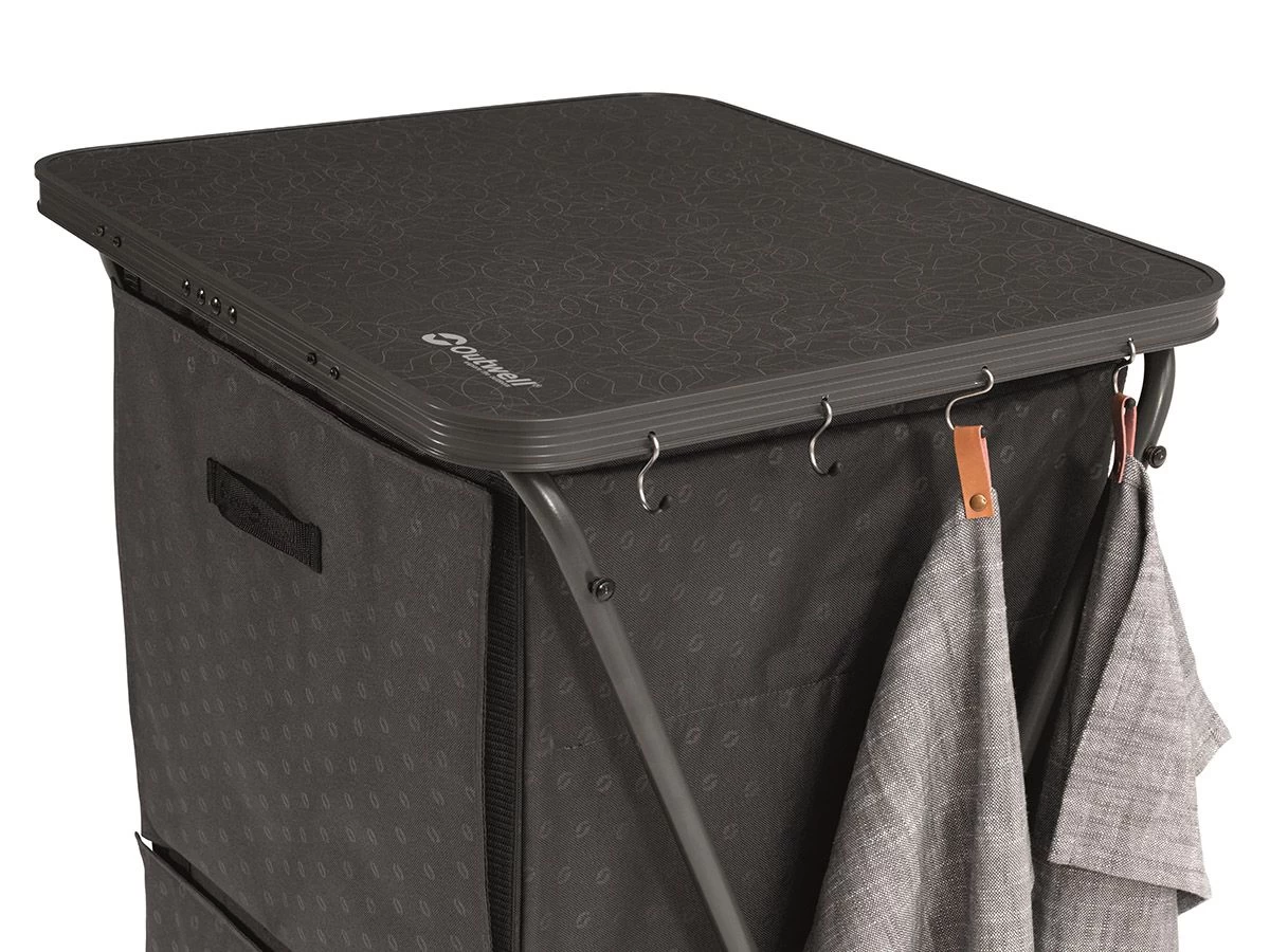 De Domingo campingkast heeft twee grote massieve planken (draagvermogen per plank tot 10 kg) en een gaasplank bovenin (draagvermogen tot 5 kg). Aan de zijkant van de kast bevindt zich een klein opbergvakje voor bijvoorbeeld je zonnebrandcrème die je elk uur even wilt gebruiken. Aan de achterkant zit een deel mesh gaas voor een goede ventilatie en luchtcirculatie. Verder zitten er aan de zijkant een aantal haakjes waar je bijvoorbeeld je hand- en theedoek aan kunt ophangen.