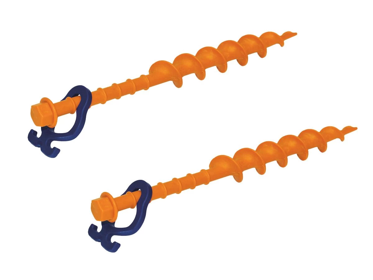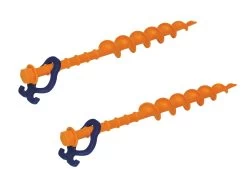 Met de optionele Kombi Tool kan je de haringen de grond indraaien, met de hand of met de boormachine. Ook kan je deze haringen gebruiken om stormbanden vast mee te zetten. Het is dan wel aan te raden om eerst voor te boren, dit voorboren kan je het beste doen met de Schroefharing S. Door de meegeleverde blauwe hoogte-clips hoef je de haring ook niet volledig de grond in te draaien. De set bestaat uit 2 Schroefharingen L.