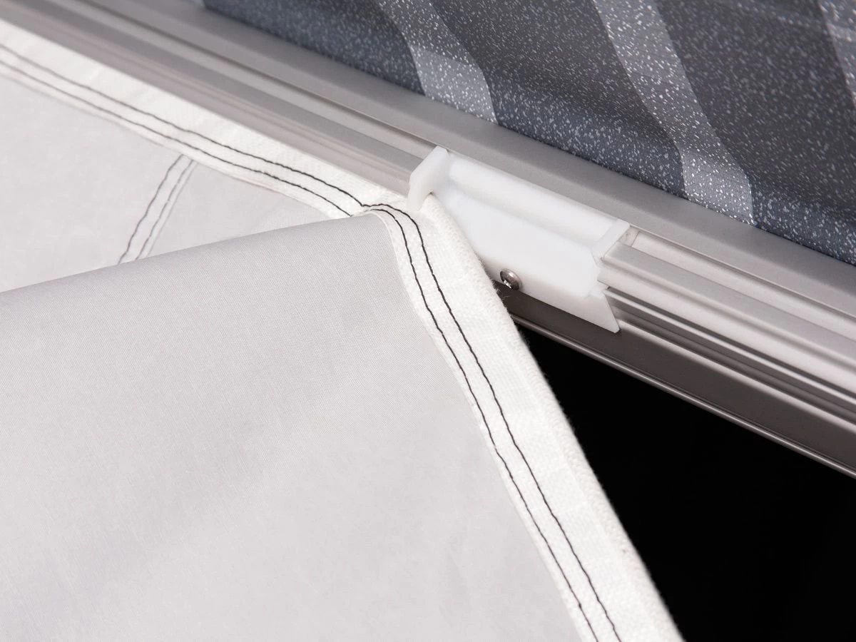 De aluminium profielen van de tent klik je eenvoudig in je luifel, daarna kan je de zijwanden erdoorheen schuiven. Zo maak je een wind- en waterdichte verbinding met je luifeldoek. Aan de achterkant zit een rubberen flap die je tegen wand van je voertuig kan klemmen. De voorwand van de Panorama kan je in de rail van je Thule Omnistor-luifel schuiven.